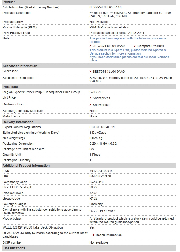*** spare part *** SIMATIC S7, memory cards for S7-1×00 CPU, 3, 3 V flash, 256 MB