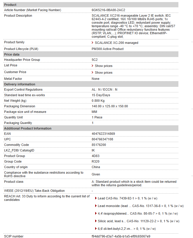 SCALANCE XC216 manageable Layer 2 IE switch; IEC 62443-4-2 certified; 16X 10/100 Mbit/s RJ45 ports; 1x console port, diagnostics LED; redundant power supply; temperature range -40 °C to +70 °C; ass……