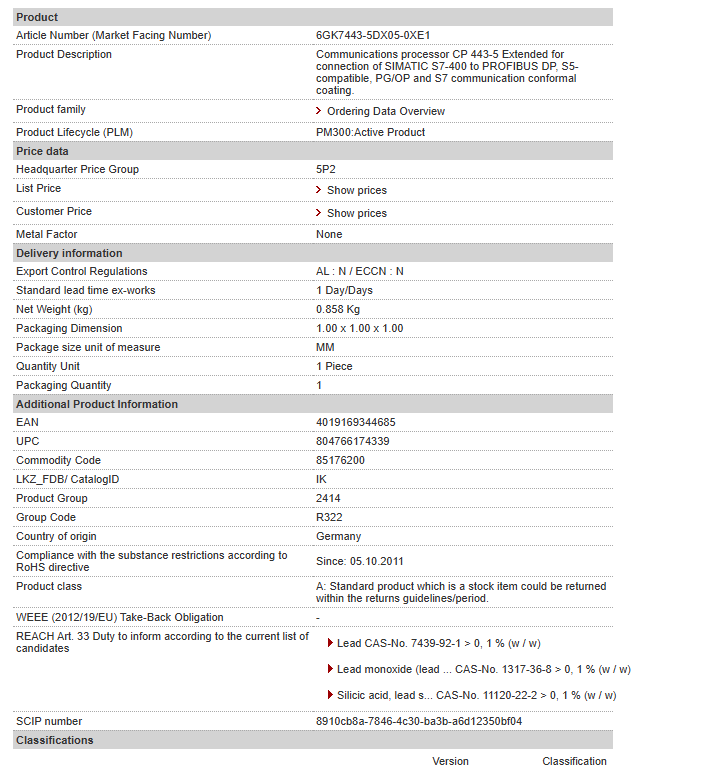 Communications processor CP 443-5 Extended for connection of SIMATIC S7-400 to PROFIBUS DP, S5-compatible, PG/OP and S7 communication conformal coating.