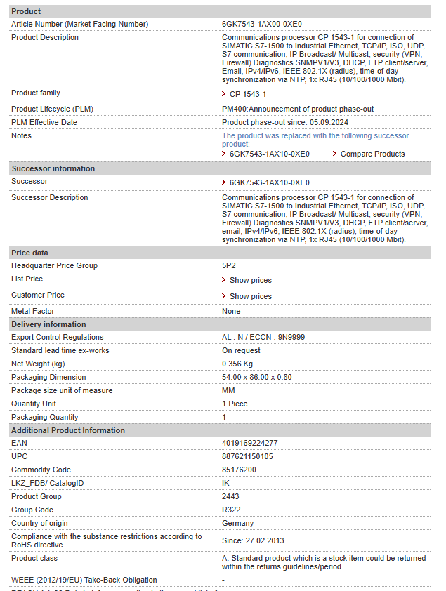 Communications processor CP 1543-1 for connection of SIMATIC S7-1500 to Industrial Ethernet, TCP/IP, ISO, UDP, S7 communication, IP Broadcast/ Multicast, security (VPN, Firewall) Diagnostics SNMPV1……