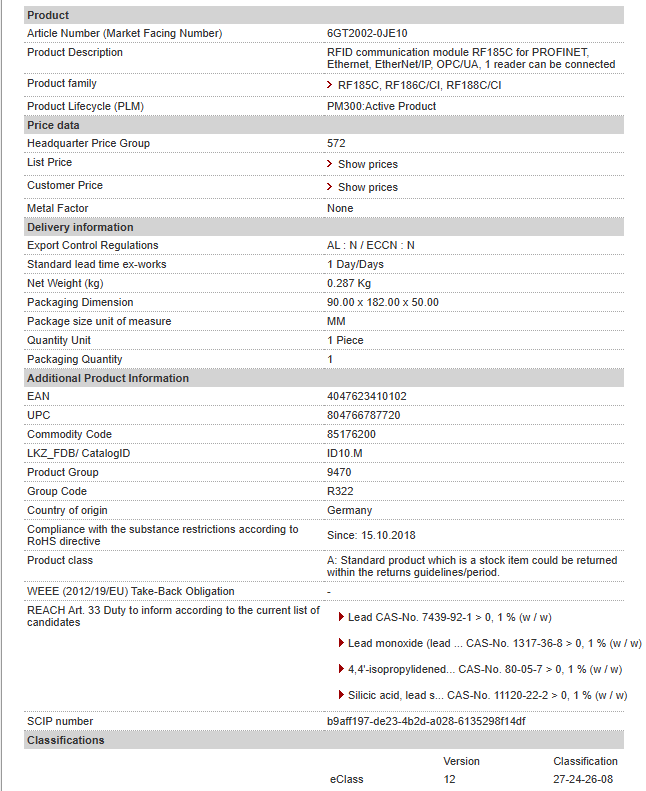 RFID communication module RF185C for PROFINET, Ethernet, EtherNet/IP, OPC/UA, 1 reader can be connected