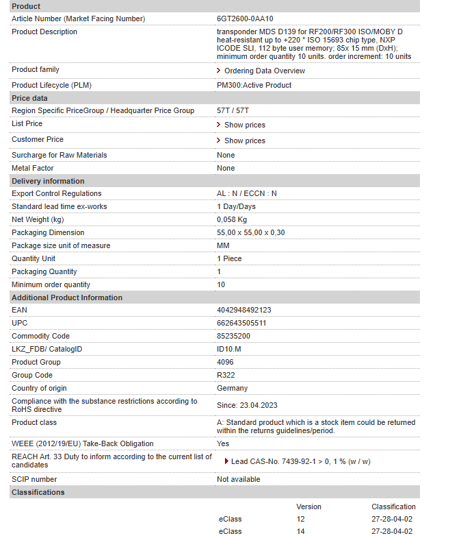transponder MDS D139 for RF200/RF300 ISO/MOBY D heat-resistant up to +220 ° ISO 15693 chip type, NXP ICODE SLI, 112 byte user memory; 85x 15 mm (DxH); minimum order quantity 10 units. order increme……