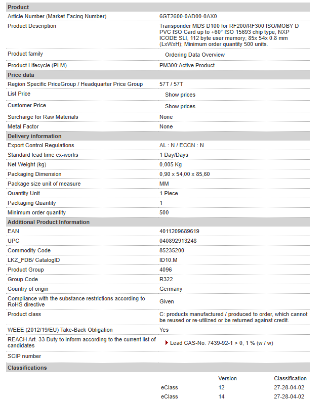 Transponder MDS D100 for RF200/RF300 ISO/MOBY D PVC ISO Card up to +60° ISO 15693 chip type, NXP ICODE SLI, 112 byte user memory; 85x 54x 0.8 mm (LxWxH); Minimum order quantity 500 units.