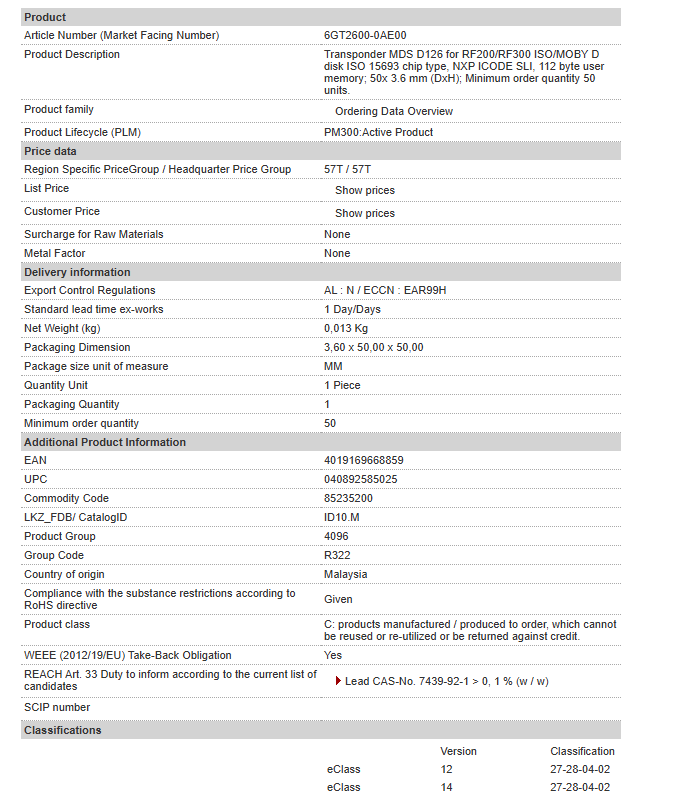 Transponder MDS D126 for RF200/RF300 ISO/MOBY D disk ISO 15693 chip type, NXP ICODE SLI, 112 byte user memory; 50x 3.6 mm (DxH); Minimum order quantity 50 units.