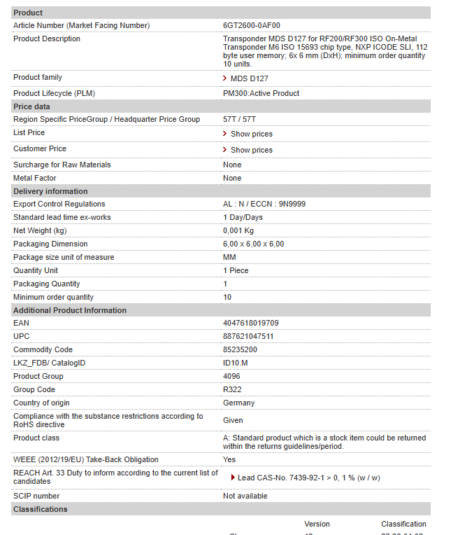 Transponder MDS D127 for RF200/RF300 ISO On-Metal Transponder M6 ISO 15693 chip type, NXP ICODE SLI, 112 byte user memory; 6x 6 mm (DxH); minimum order quantity 10 units.