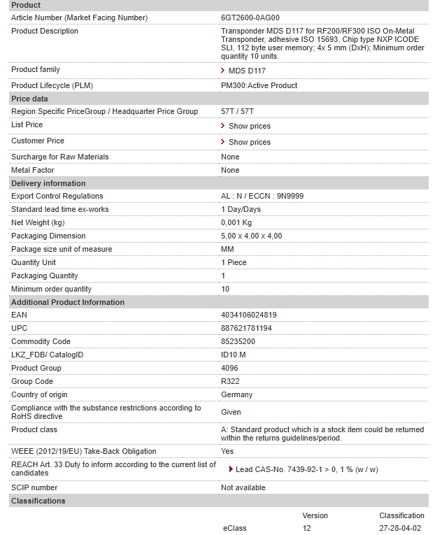 Transponder MDS D117 for RF200/RF300 ISO On-Metal Transponder, adhesive ISO 15693, Chip type NXP ICODE SLI, 112 byte user memory; 4x 5 mm (DxH); Minimum order quantity 10 units.