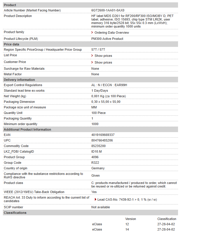 HF label MDS D261 for RF200/RF300 ISO/MOBY D, PET label, adhesive, ISO 15693, chip type STM LRI2K, user memory 316 byte/2528 bit; 55x 55x 0.3 mm (LxWxH); minimum order quantity 1000 units