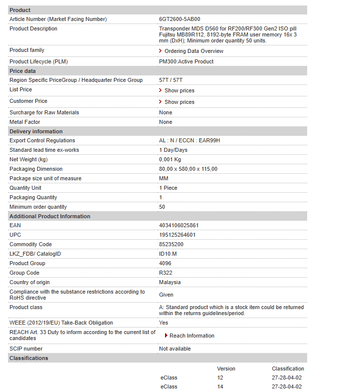 Transponder MDS D560 for RF200/RF300 Gen2 ISO pill Fujitsu MB89R112, 8192-byte FRAM user memory 16x 3 mm (DxH); Minimum order quantity 50 units.