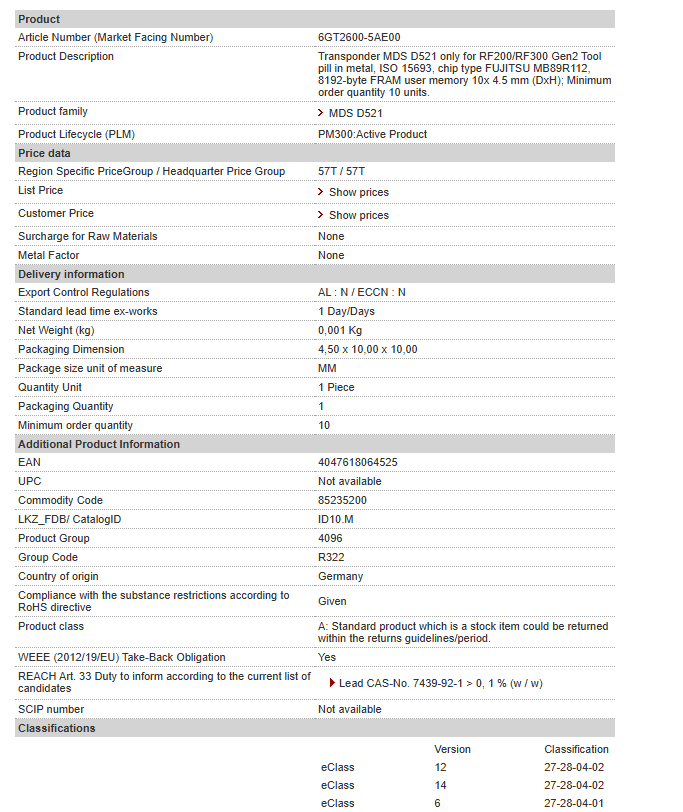Transponder MDS D521 only for RF200/RF300 Gen2 Tool pill in metal, ISO 15693, chip type FUJITSU MB89R112, 8192-byte FRAM user memory 10x 4.5 mm (DxH); Minimum order quantity 10 units.