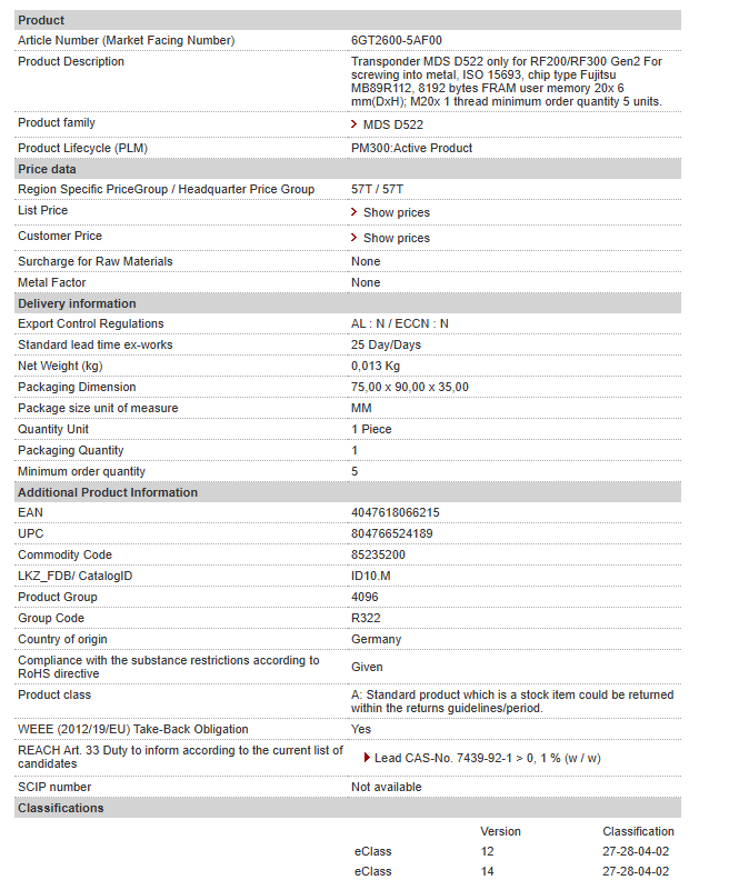 Transponder MDS D522 only for RF200/RF300 Gen2 For screwing into metal, ISO 15693, chip type Fujitsu MB89R112, 8192 bytes FRAM user memory 20x 6 mm(DxH); M20x 1 thread minimum order quantity 5 unit……