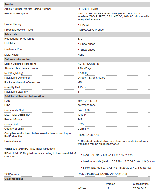 SIMATIC RF300 Reader RF380R (GEN2) RS422/232 interface (3964R) IP67, -25 to +70 °C, 160x 80x 41 mm with integrated antenna.