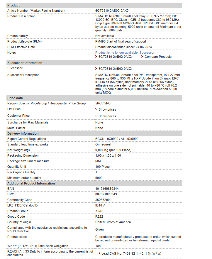 SIMATIC RF630L SmartLabel Inlay PET; 97x 27 mm; ISO 18000-6C, EPC Class 1 GEN 2 frequency 860 to 960 MHz, Chip Type IMPINJI MONZA 4QT, 128 bit EPC memory, 64 bytes add-on memory, 5000 units on one ……