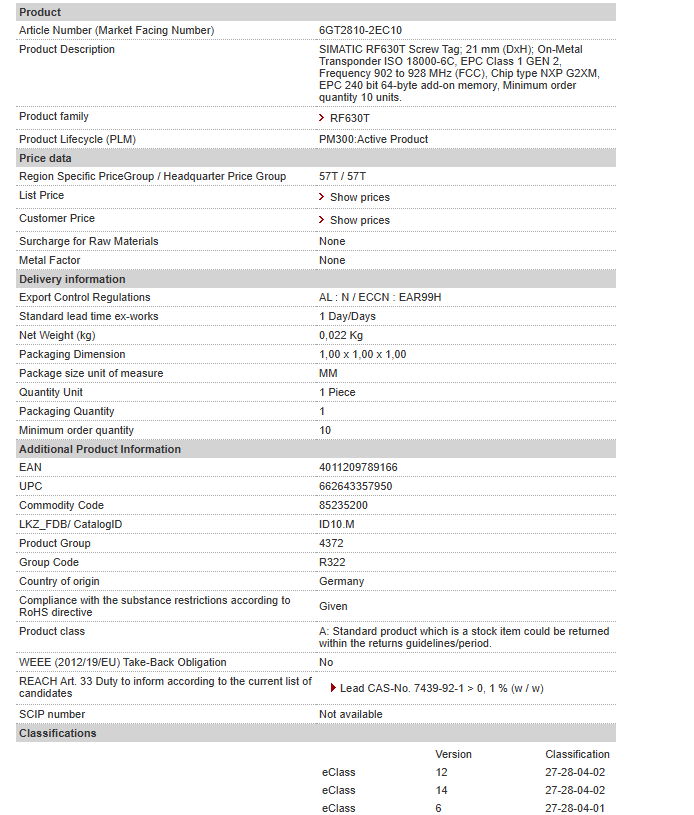 SIMATIC RF630T Screw Tag; 21 mm (DxH); On-Metal Transponder ISO 18000-6C, EPC Class 1 GEN 2, Frequency 902 to 928 MHz (FCC), Chip type NXP G2XM, EPC 240 bit 64-byte add-on memory, Minimum order qua……
