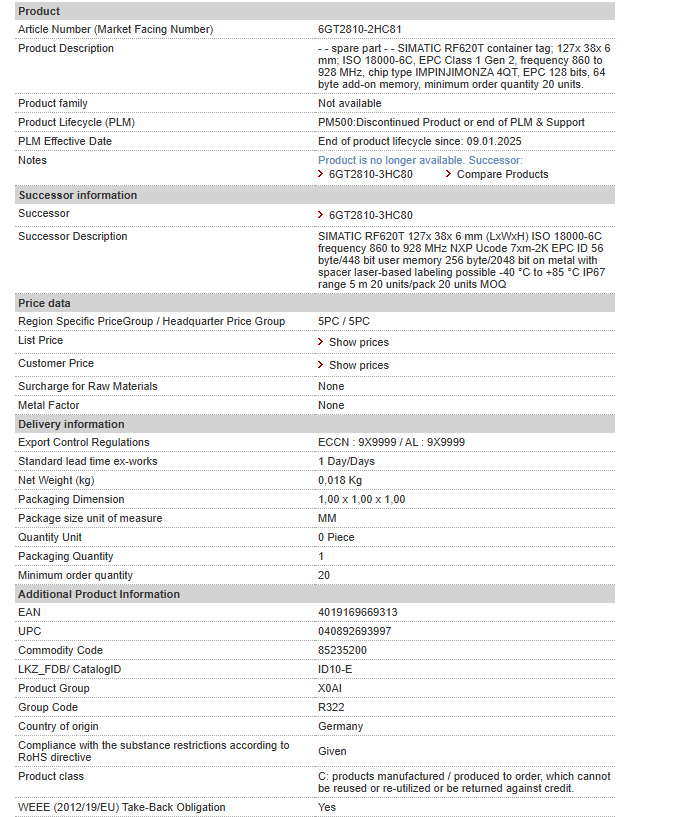 – – spare part – – SIMATIC RF620T container tag; 127x 38x 6 mm; ISO 18000-6C, EPC Class 1 Gen 2, frequency 860 to 928 MHz, chip type IMPINJIMONZA 4QT, EPC 128 bits, 64 byte ……