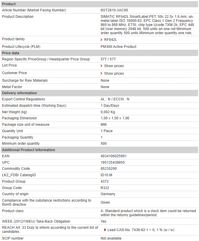 SIMATIC RF642L SmartLabel PET; 50x 22.5x 1.6 mm; on-metal label ISO 18000-63, EPC Class 1 Gen 2 Frequency 860 to 868 MHz, ETSI, chip type Ucode 7XM-2k, EPC 448 bit User memory 2048 bit, 500 units o……