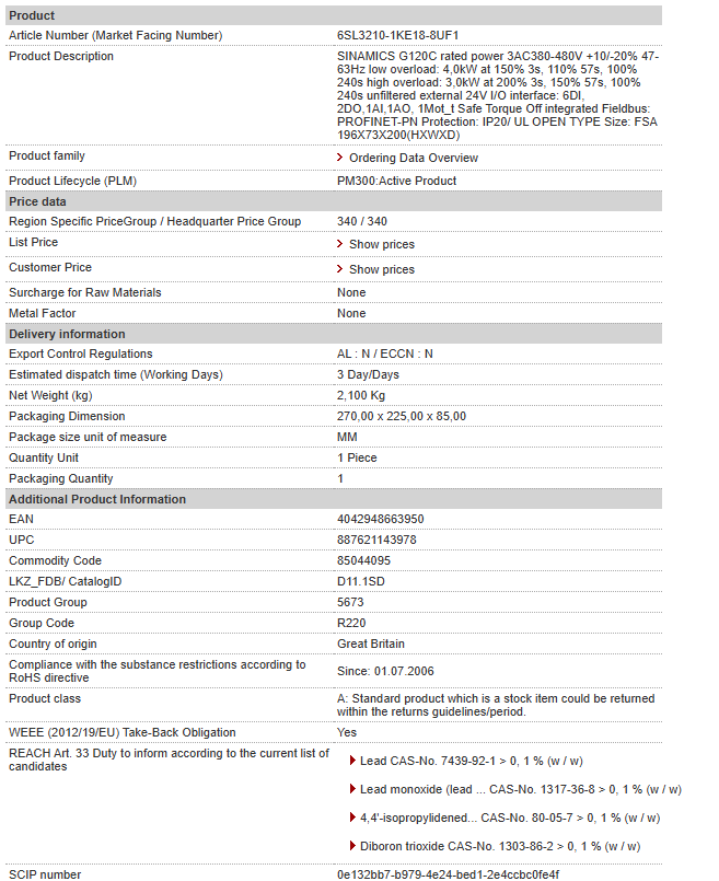 SINAMICS G120C rated power 3AC380-480V +10/-20% 47-63Hz low overload: 4,0kW at 150% 3s, 110% 57s, 100% 240s high overload: 3,0kW at 200% 3s, 150% 57s, 100% 240s unfiltered external 24V I/O interfac……
