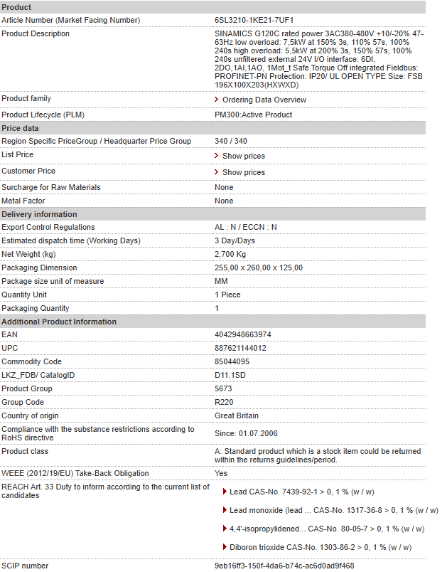 SINAMICS G120C rated power 3AC380-480V +10/-20% 47-63Hz low overload: 7,5kW at 150% 3s, 110% 57s, 100% 240s high overload: 5,5kW at 200% 3s, 150% 57s, 100% 240s unfiltered external 24V I/O interfac……