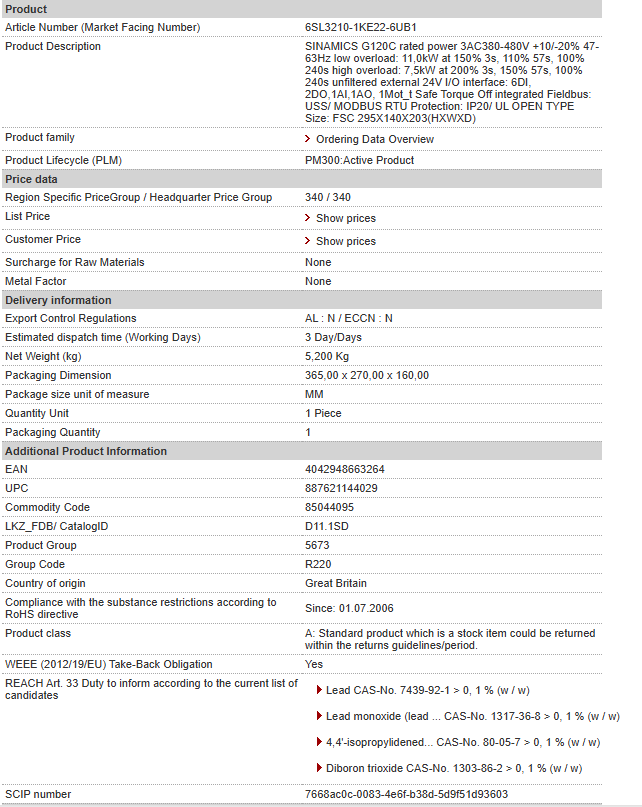 SINAMICS G120C rated power 3AC380-480V +10/-20% 47-63Hz low overload: 11,0kW at 150% 3s, 110% 57s, 100% 240s high overload: 7,5kW at 200% 3s, 150% 57s, 100% 240s unfiltered external 24V I/O interfa……