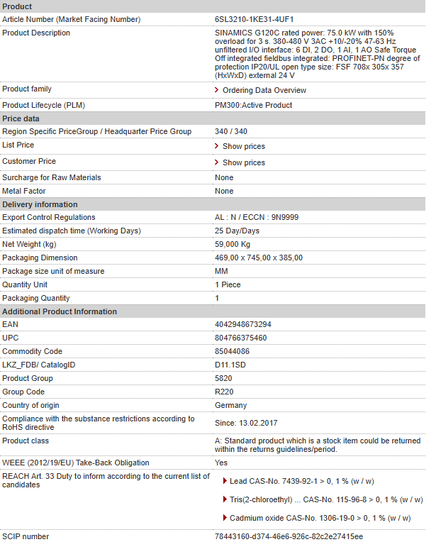 SINAMICS G120C rated power: 75.0 kW with 150% overload for 3 s. 380-480 V 3AC +10/-20% 47-63 Hz unfiltered I/O interface: 6 DI, 2 DO, 1 AI, 1 AO Safe Torque Off integrated fieldbus integrated: PROF……