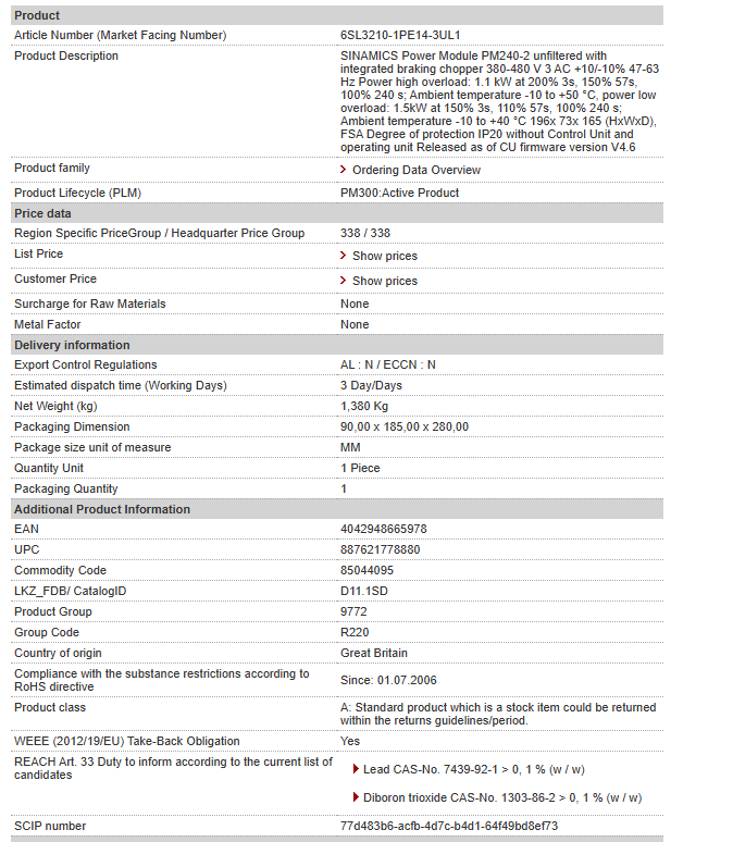 SINAMICS Power Module PM240-2 unfiltered with integrated braking chopper 380-480 V 3 AC +10/-10% 47-63 Hz Power high overload: 1.1 kW at 200% 3s, 150% 57s, 100% 240 s; Ambient temperature -10 to +5……