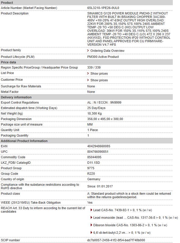 SINAMICS G120 POWER MODULE PM240-2 WITHOUT FILTER WITH BUILT IN BRAKING CHOPPER 3AC380-480V +10/-20% 47-63HZ OUTPUT HIGH OVERLOAD: 22KW FOR 200% 3S,150% 57S,100% 240S AMBIENT TEMP -20 TO +50 DEG C ……