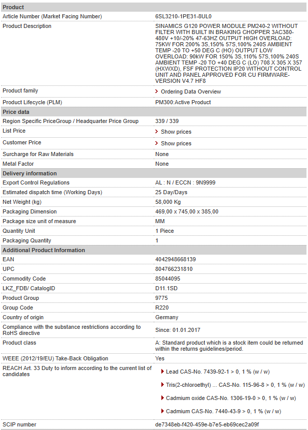 SINAMICS G120 POWER MODULE PM240-2 WITHOUT FILTER WITH BUILT IN BRAKING CHOPPER 3AC380-480V +10/-20% 47-63HZ OUTPUT HIGH OVERLOAD: 75KW FOR 200% 3S,150% 57S,100% 240S AMBIENT TEMP -20 TO +50 DEG C ……