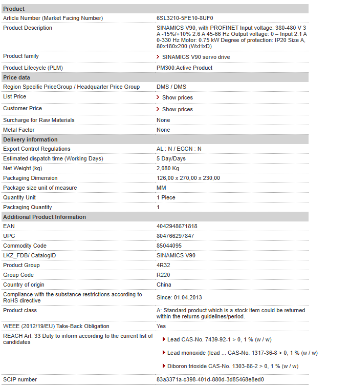 SINAMICS V90, with PROFINET Input voltage: 380-480 V 3 A -15%/+10% 2.6 A 45-66 Hz Output voltage: 0 – Input 2.1 A 0-330 Hz Motor: 0.75 kW Degree of protection: IP20 Size A, 80x180x200 (WxHxD)