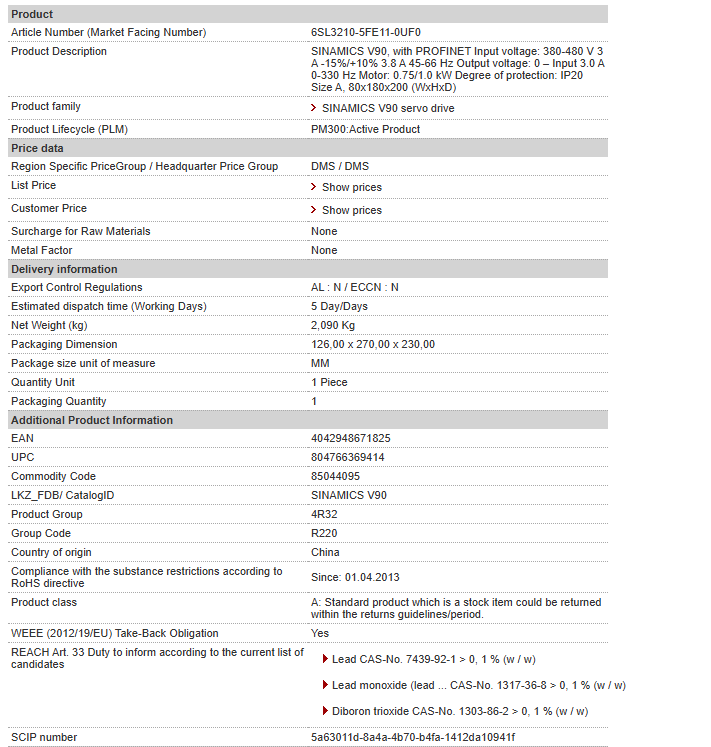 SINAMICS V90, with PROFINET Input voltage: 380-480 V 3 A -15%/+10% 3.8 A 45-66 Hz Output voltage: 0 – Input 3.0 A 0-330 Hz Motor: 0.75/1.0 kW Degree of protection: IP20 Size A, 80x180x200 (WxHxD) ……