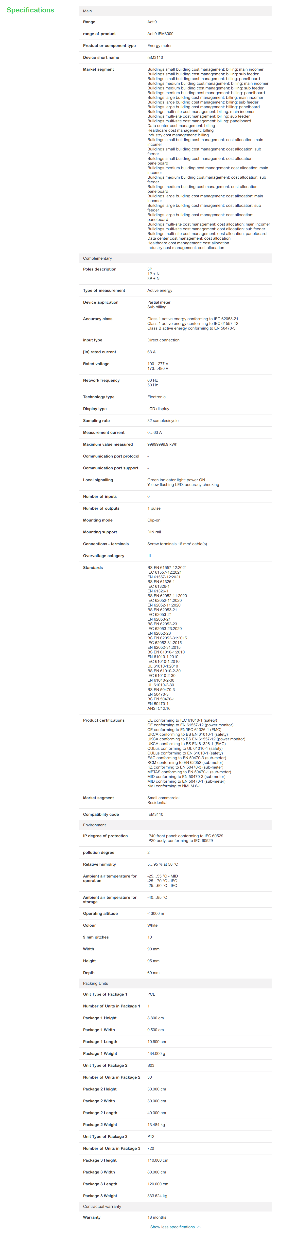 iEM3110 energy meter – 63 A – 1 pulse O