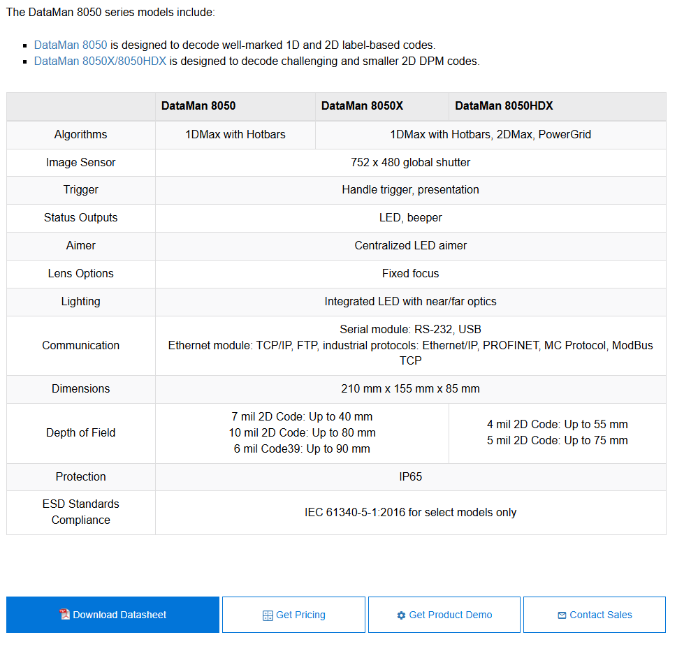 DataMan 8050 series handheld barcode readers are equipped with patented decoding algorithms to read well-marked 1D and 2D barcodes, including direct part mark (DPM) codes, in the harshest manufactu……