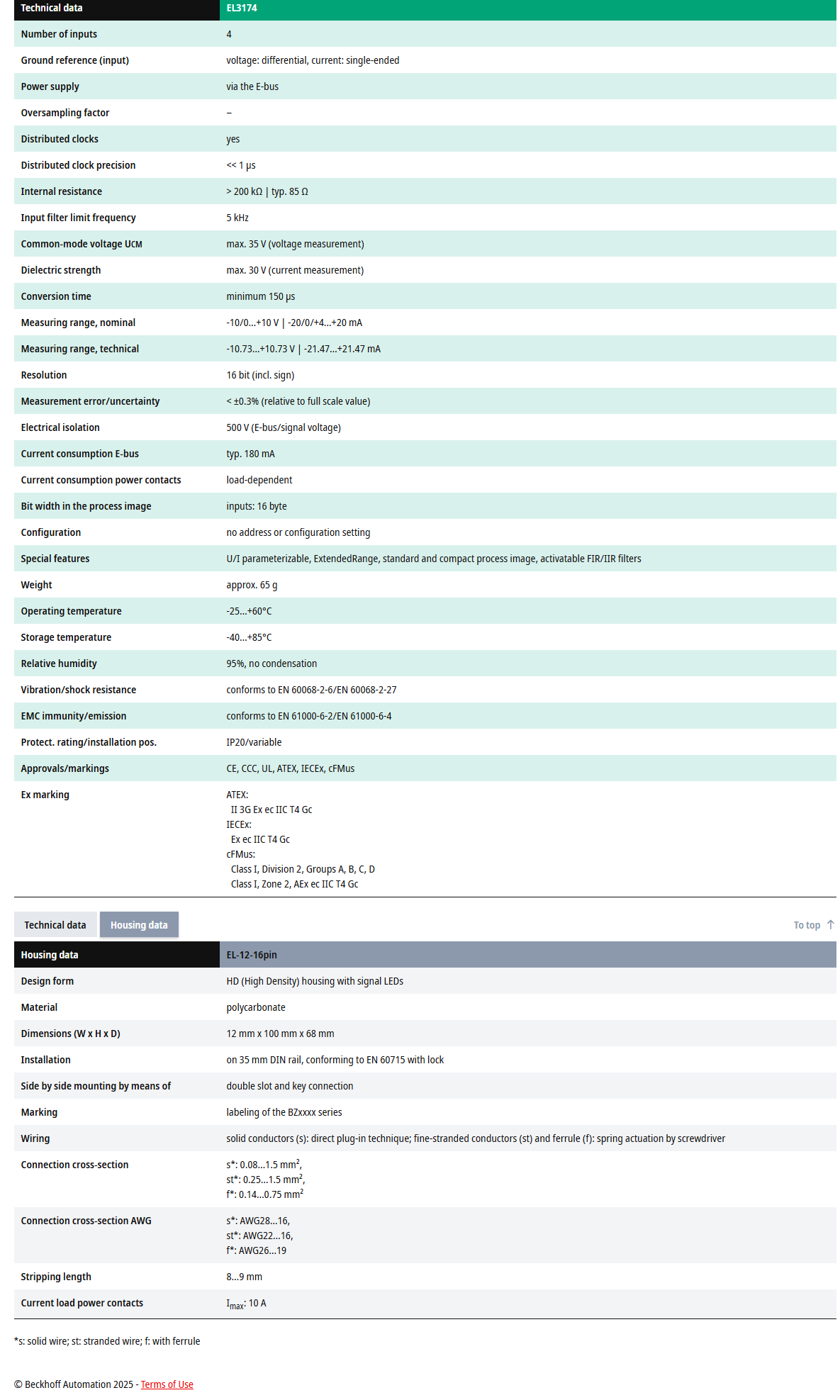 The EL3174 analog input terminal has four individually parameterizable inputs. Signals in the range from -10/0 to +10 V or -20/0/+4 to +20 mA can be processed via each channel. Physically, the volt……