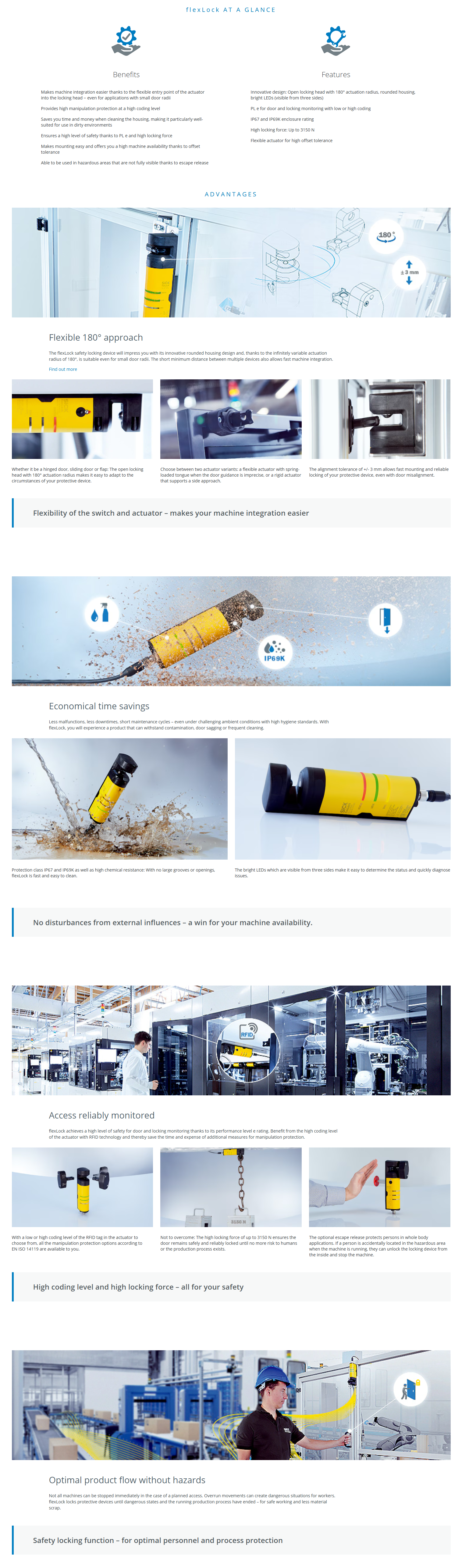 flexLock The flexLock safety locking device with RFID monitoring is characterized by an infinitely variable actuation radius of 180°. It thus offers a high level of flexibility for the safety lo……