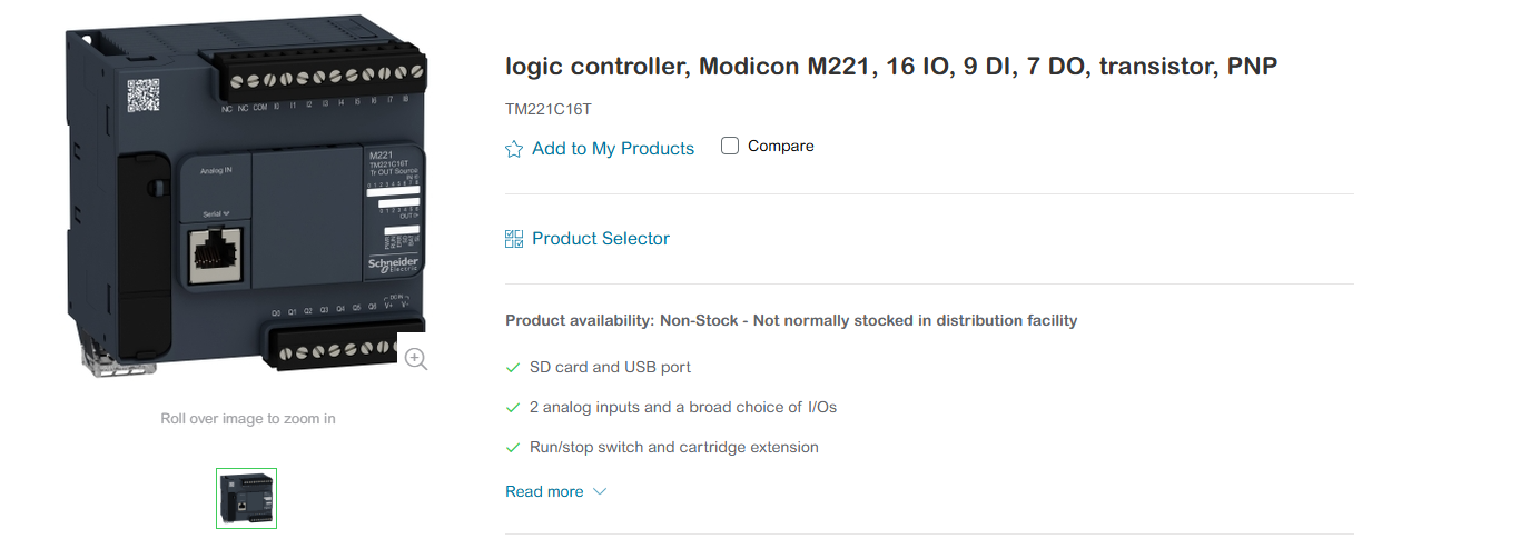 logic controller, Modicon M221, 16 IO, 9 DI, 7 DO, transistor, PNP