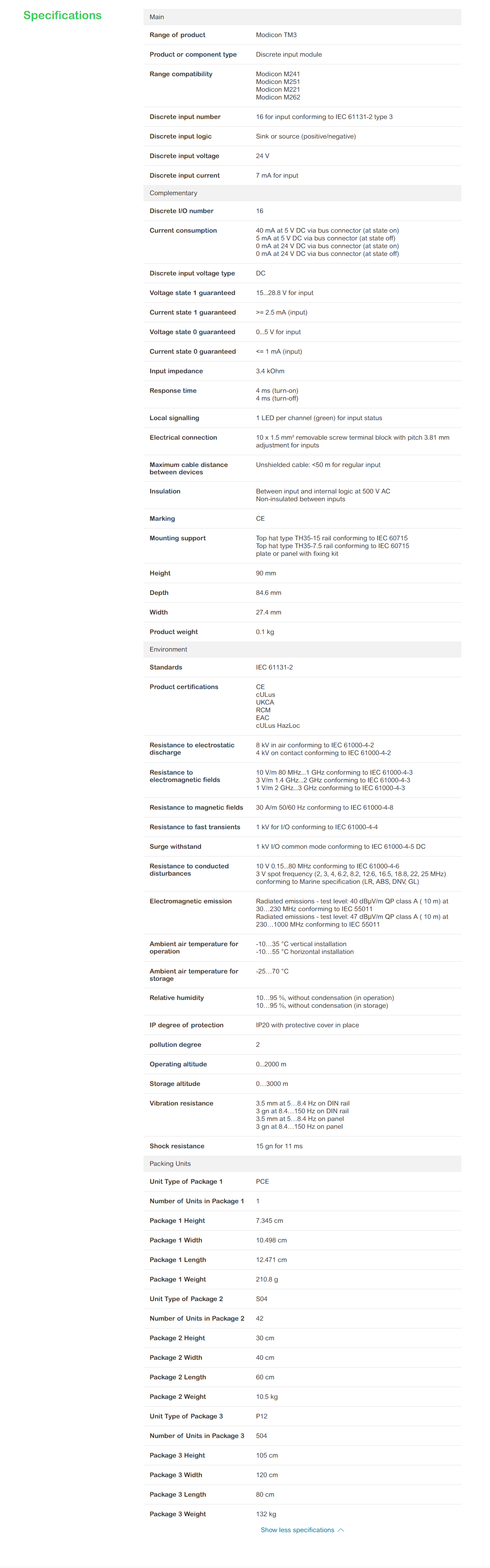 discrete input module, Modicon TM3, 16 inputs, screw, 24V DC